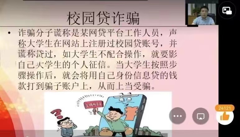 人身财产安全是大学生学习生活顺利进行的基本保障。汪书记以真实贴切的案例讲解了校园贷、网络贷,投资理财诈骗,冒充公检法诈骗,网络游戏诈骗,网络刷单等不同类型诈骗的手段,并用“六个一、八个凡是”告诉同学们要谨防电信诈骗,强调要不听不信不转账。同时提醒各位同学提高防盗意识,保护好自己的人身财产安全,愉快度过大学生活。