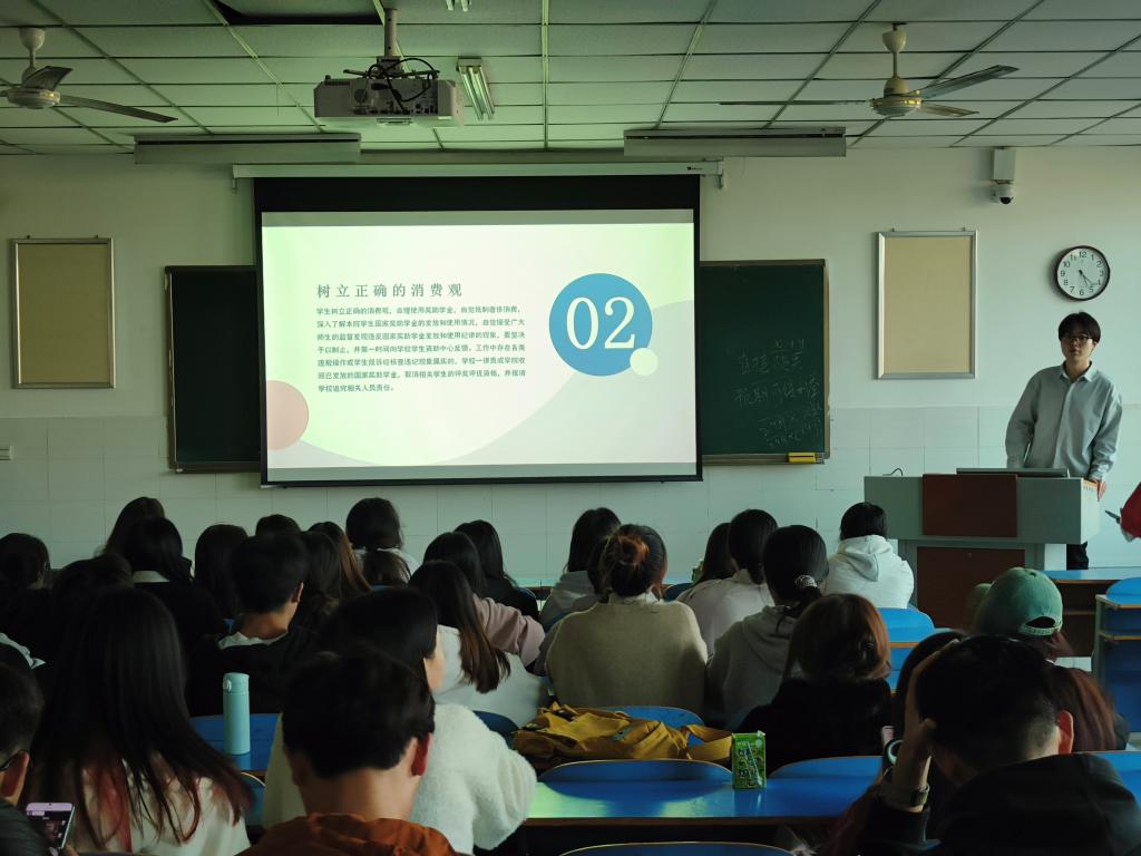 在班会中,辛梦圆老师首先宣布了国家奖助学金的发放计划,强调奖助学金是对学生辛勤努力的认可,同时也提及奖助学金的正确使用是对学生自身财务管理能力的一种锻炼。鼓励同学们要理性看待奖助学金,更要明确用途,合理规划资金的使用,杜绝浪费。随后,为同学们详细解读了消费观念的重要性,倡导理性消费,提醒同学们避免陷入奢侈消费的陷阱。通过实例分析,阐述了如何在生活中实现经济有效支出,培养正确的理财观念。