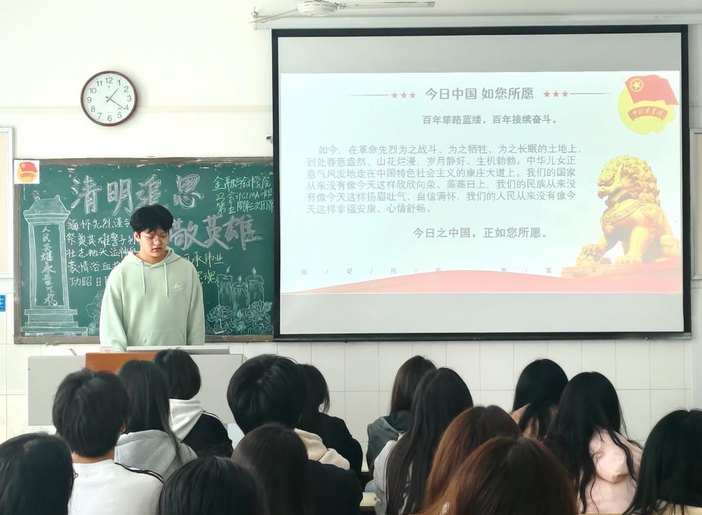 伴随着嘹亮的团歌声,各团支部组织的团课相继开展。在本次团课中,各班团支书介绍了清明的起源,并向同学们介绍清明的习俗,有踏青、扫墓、吃青团等。接着,团支书从同学们熟知的邱少云等英雄模范人物引入革命英烈的故事,让同学们明白我们今天幸福生活的来之不易。最后,团支书组织同学们观看相关革命英烈的视频,同学们积极讨论感悟,并进行分享,团课氛围十分活跃。