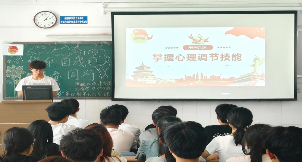 为引导团员青年关注心理健康,提升心理健康素养,掌握心理调节技能,学会合理应对学业、就业、人际、恋爱等方面带来的压力,正确认识、接纳、关爱和发展自我,23智会02、23智会01、23智金 01、23智金02、23智金03开展以“悦纳自我,青春同行”为主题的线下团课活动。