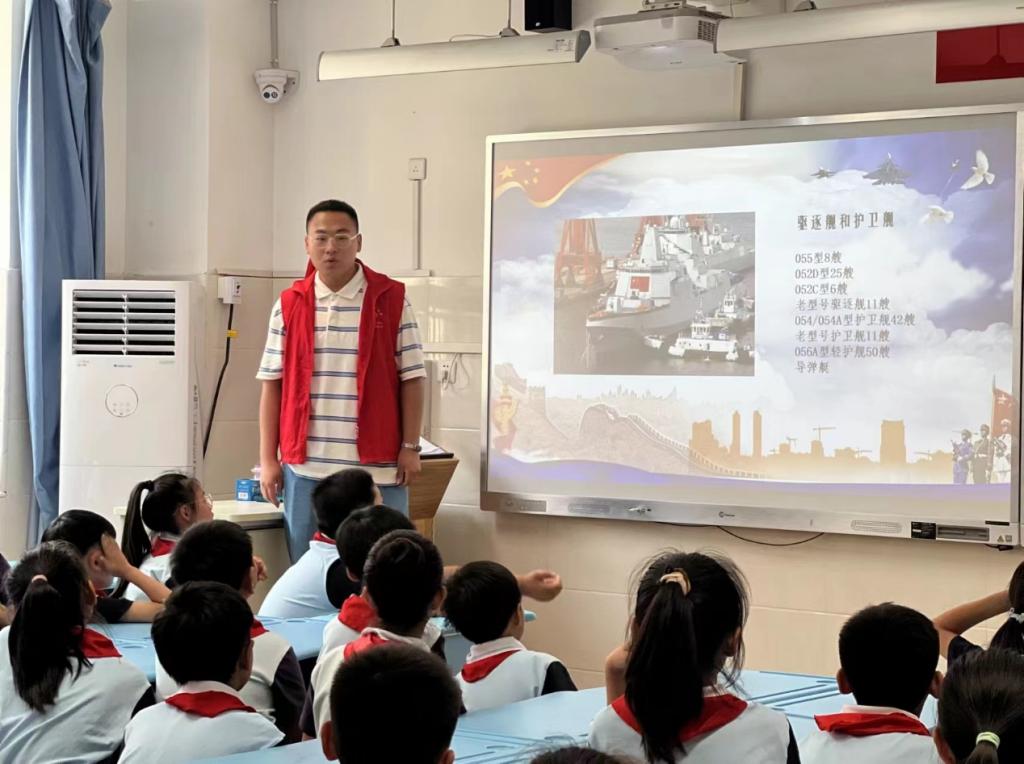 到达活动班级后,志愿者们先是引导小学生们合作完成了“接力吹乒乓球”的小游戏进行热场,小学生们都兴致勃勃的参与其中,不甘示弱。游戏环节后,主讲人详细为小学生们讲解了我国国防的现状,包括对国家安全环境的深入剖析以及国防战略的调整等重要内容,使小学生们清晰认识到强国强军的重要性。接着,主讲人通过ppt演示生动回顾了我国军队的发展历程,从历史中让孩子们体会到军队与国家命运的紧密联系。此外,还着重介绍了目前我国最新型的舰艇以及战机,阐释了它们在现代战争中的关键作用和重大意义。