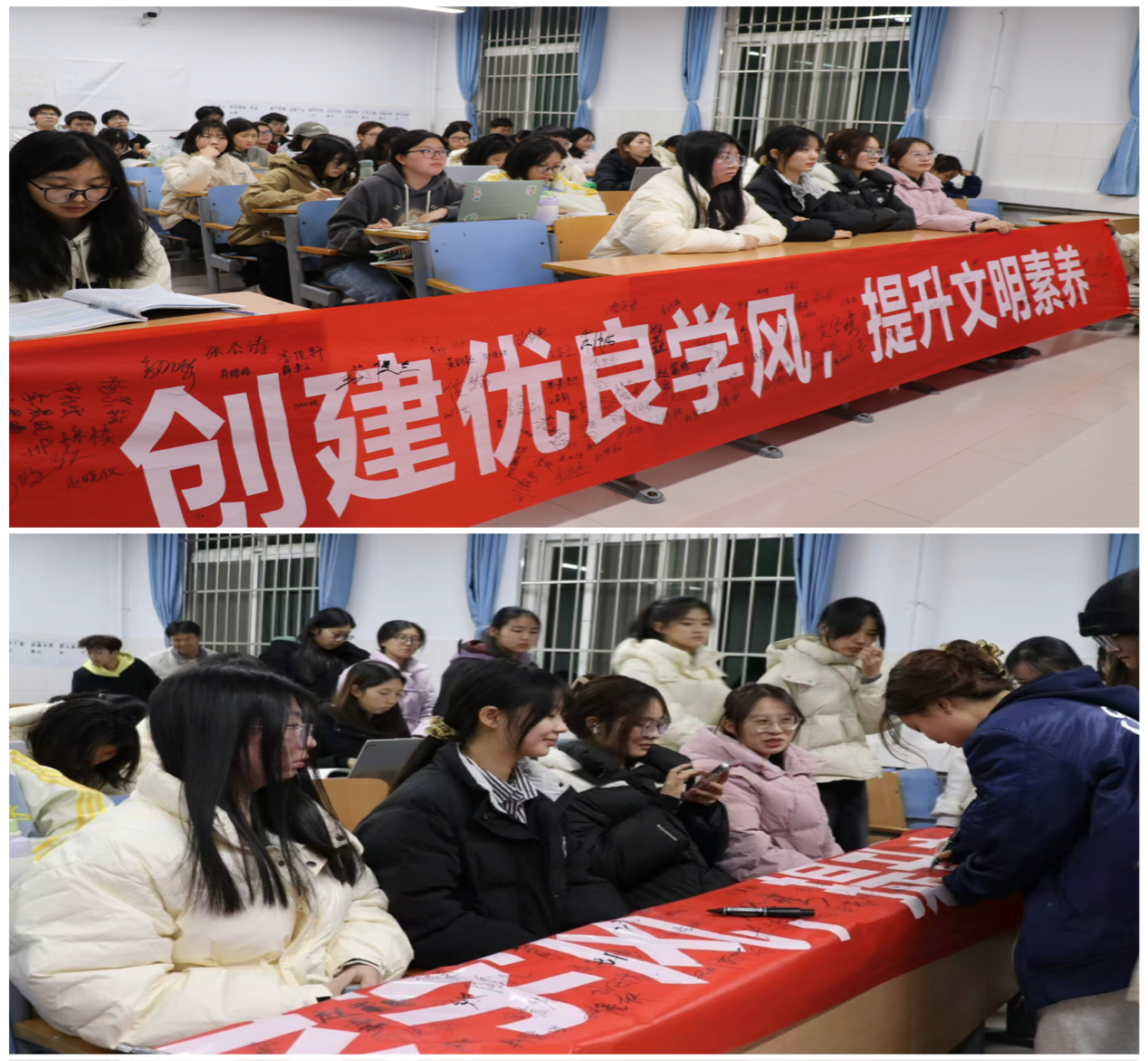 活动伊始,顾老师指出,学风建设是高校立德树人的重要载体,是引导青年大学生听党话、跟党走、立大志、明大德、成大才、担大任的重要途径,也是全面实现高质量人才培养目标的重要手段,并着重强调了加强学风建设和提升文明素养在大学生成长成才中的重要性,他希望同学们能积极参与学风建设活动,自觉养成良好的学习生活习惯。顾老师还结合学院学风建设主题教育方案对相关内容和要求进行了详细解读。随后,签名活动正式开始,同学们有序的在横幅上签下了自己的名字。每一个签名都代表着一份承诺,大家纷纷表达了对创建优良学风和提升文明素养的坚定信念。