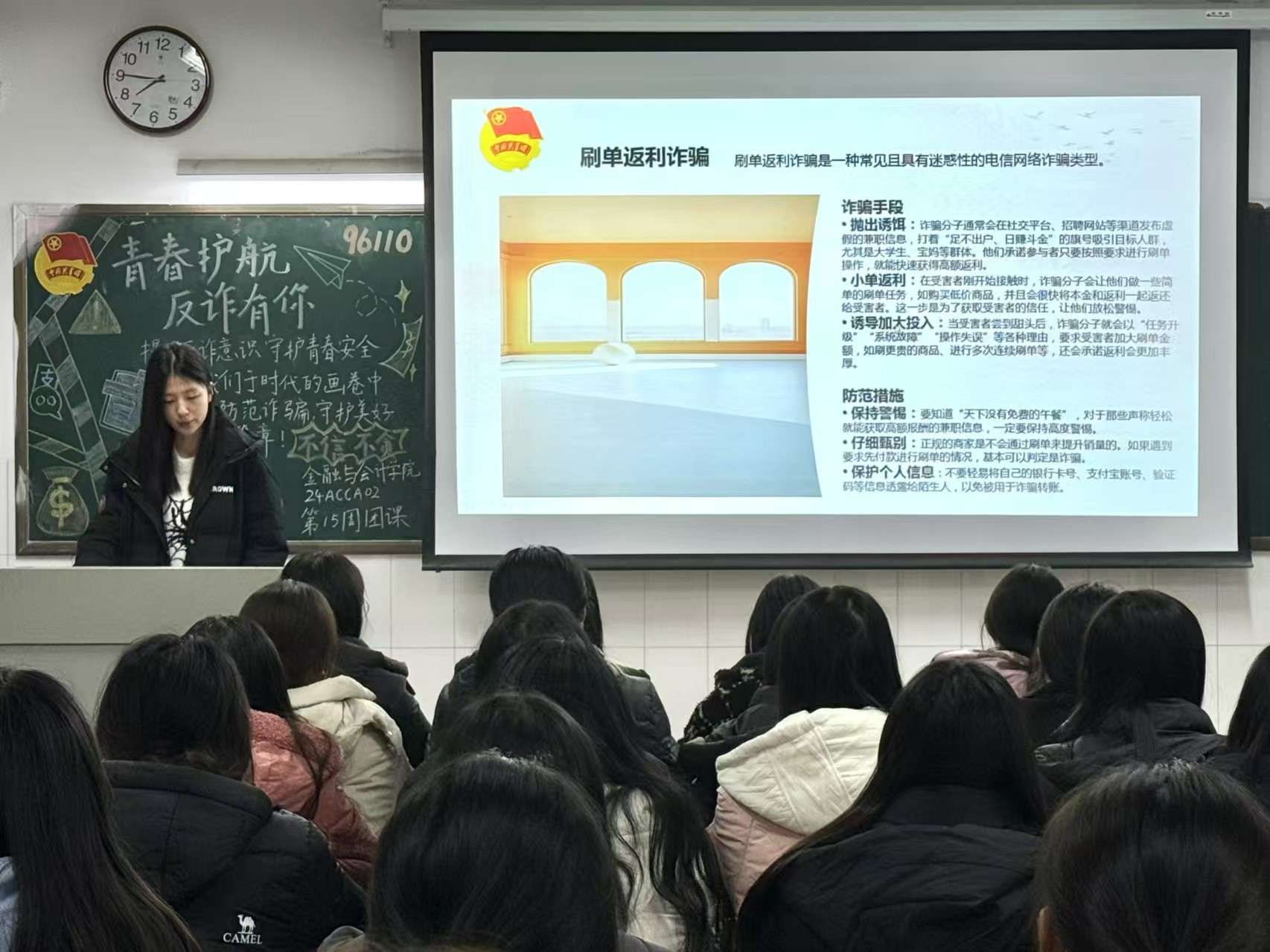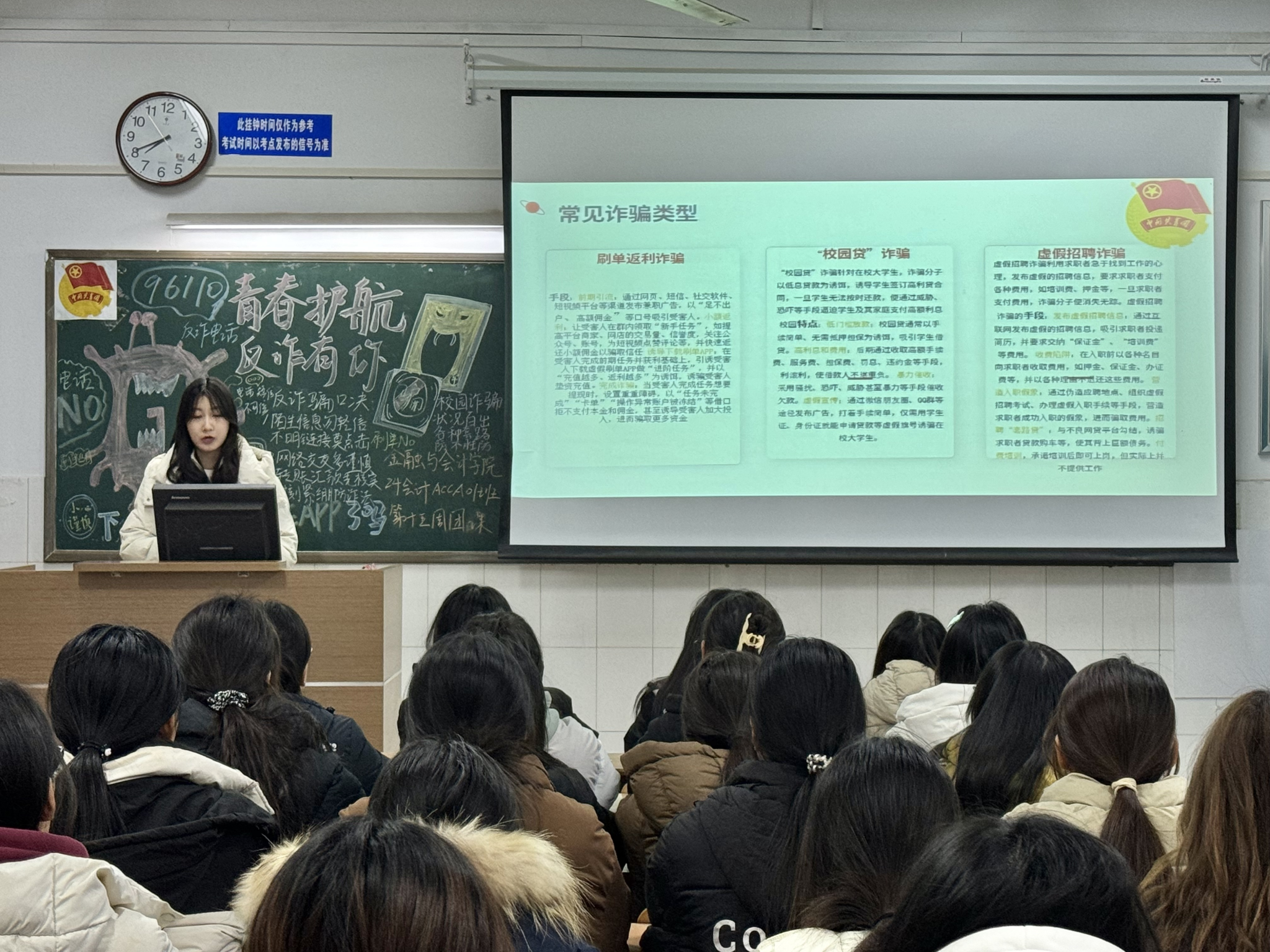 伴随着嘹亮的团歌声,团课活动正式开始。首先,主讲人讲解了社会上出现的典型诈骗案例,如网络购物退款诈骗、兼职刷单诈骗、冒充公检法诈骗等,分析诈骗分子作案手法与特点。然后,通过播放反诈宣传视频,直观呈现了诈骗的场景与危害,使同学们印象深刻。接着是互动环节,大家分享身边案例,探讨应对方法,提出疑问并交流经验。最后,通过组织反诈知识竞答,以小组形式抢答,巩固了同学们关于防诈骗的知识,激发了同学们的学习积极性。