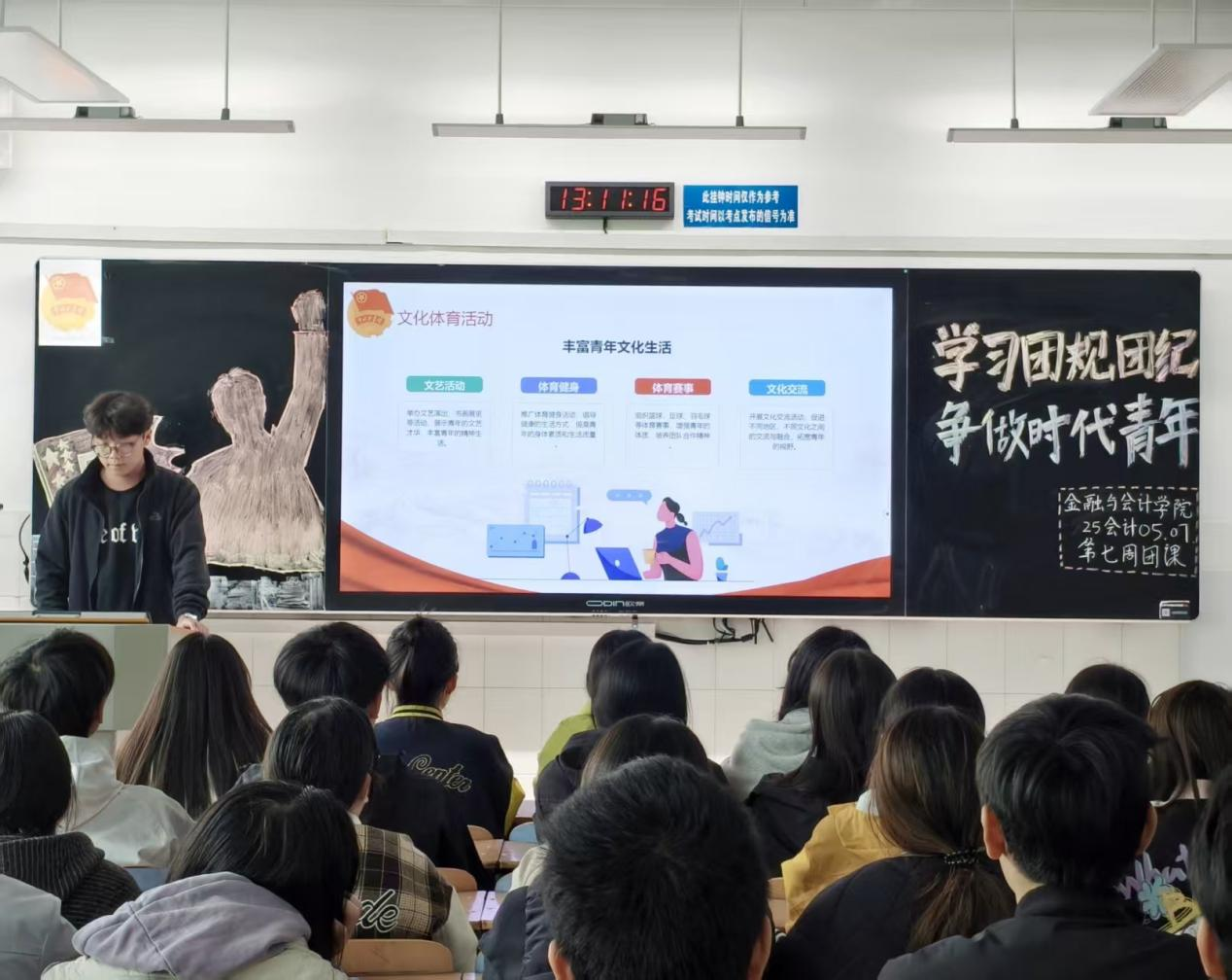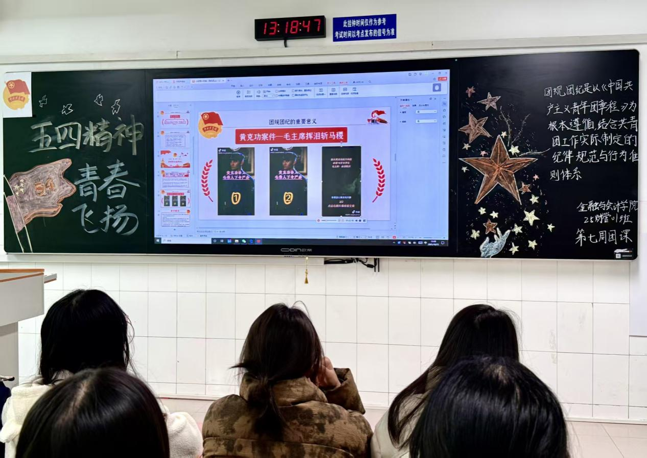 在嘹亮团歌声中,各班团课活动有序展开。活动伊始,各班团支书播放有关中国共青团团规团纪的视频,引发了同学们对团规团纪的思考。接着,团支书带领同学们深入学习《中国共产主义青年团章程》《中国共产主义青年团纪律处分条例》等文件,领学团章章节,解读纪律条款,让纪律条款变得具体可感,帮助团员明确“什么能做,什么不能做”,建立基本认知框架,使同学们更加深入地了解到中国共青团的团规团纪。在此过程中,各班还进行了一些互动活动,如团规团纪知识问答,使同学们对团规团纪知识有了深刻领会。
