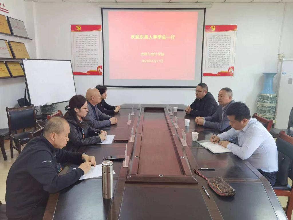2023年4月27日上午,东吴人寿河南省分公司副总经理李强与高雷(东吴人寿河南省分公司团险部经理)、陈晨(东吴人寿郑州市公司团险部经理)等一行三人来到我校Beat365唯一官方网站,与学院党委书记陈复昌、院长黄良杰、副院长邵翠丽、王培玲及保险专业负责人张智勇老师进行了深入交流。
