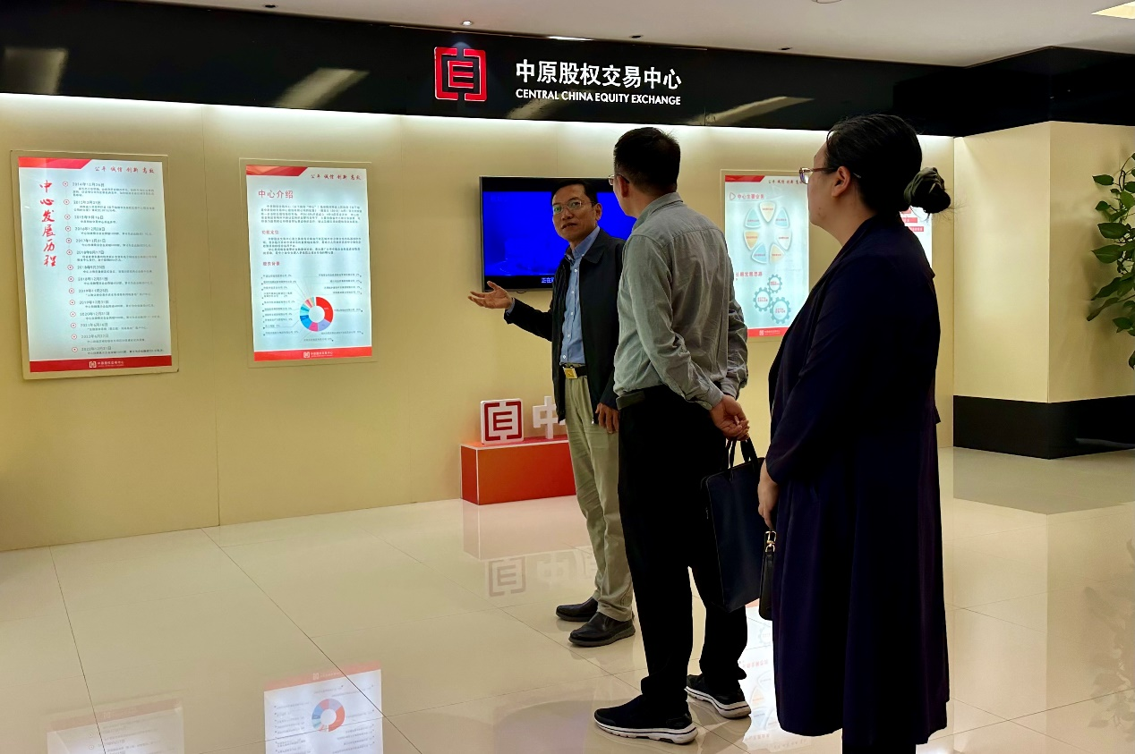 在调研过程中,贾院长介绍了学校的基本情况,学院的科研团队,主要研究项目和研究成果等。中原股权交易中心副书记付强介绍了中心的功能定位、主要业务、板块设置以及中长期发展思路等基本情况。双方讨论了股权交易市场发展、股权转让和质押、挂牌企业的培育孵化、多元融资渠道的建设、与其他金融机构的合作和股权投资生态圈建设过程中存在的难题,并对多层次资本市场体系建设进程当中面临的资产估值、风险控制、市场培育、金融创新、制度创新和产学研深度融合等方面的实际问题提出了建设性意见。