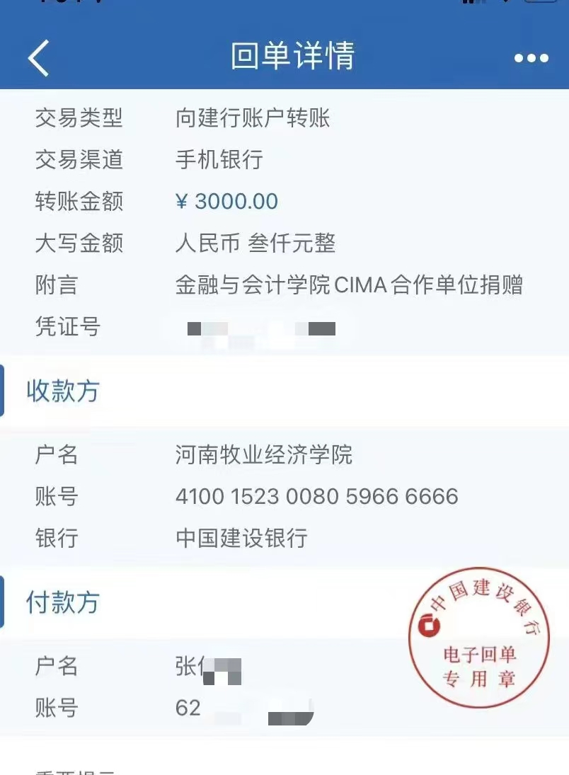14级注会5班田野同学、18CIMA班张靖同学向学校爱心捐款400