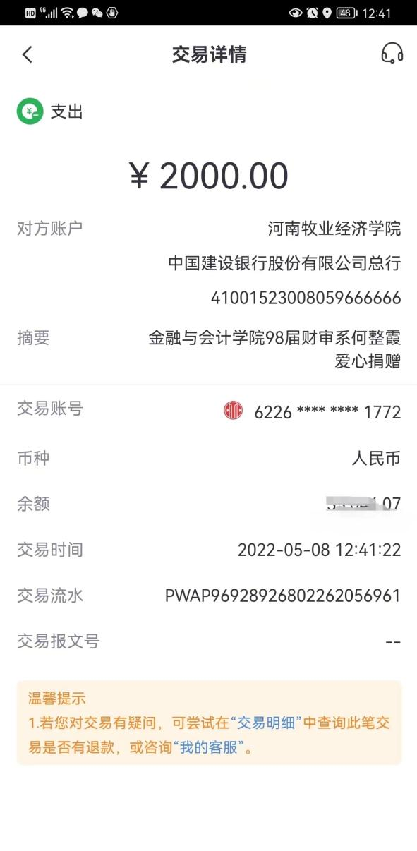 98届会电2班毕业生双汇集团财务总监何整霞向学校爱心捐款2000