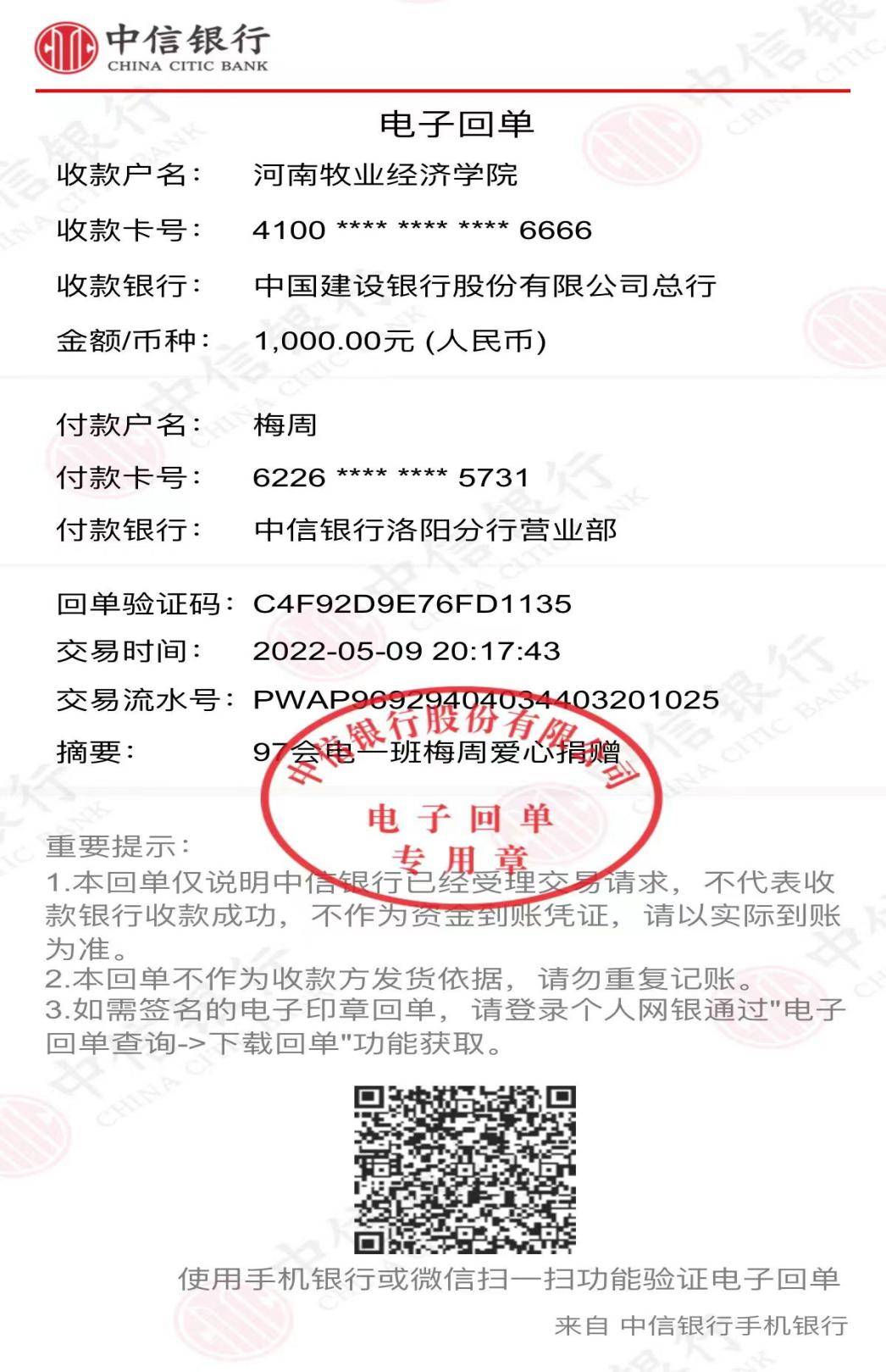 母校情深,爱心筑梦。97会电1班校友、深圳市盛业投资管理有限公司总经理梅周同学向学校进行个人爱心捐款1000元。